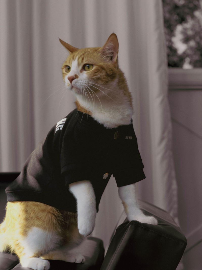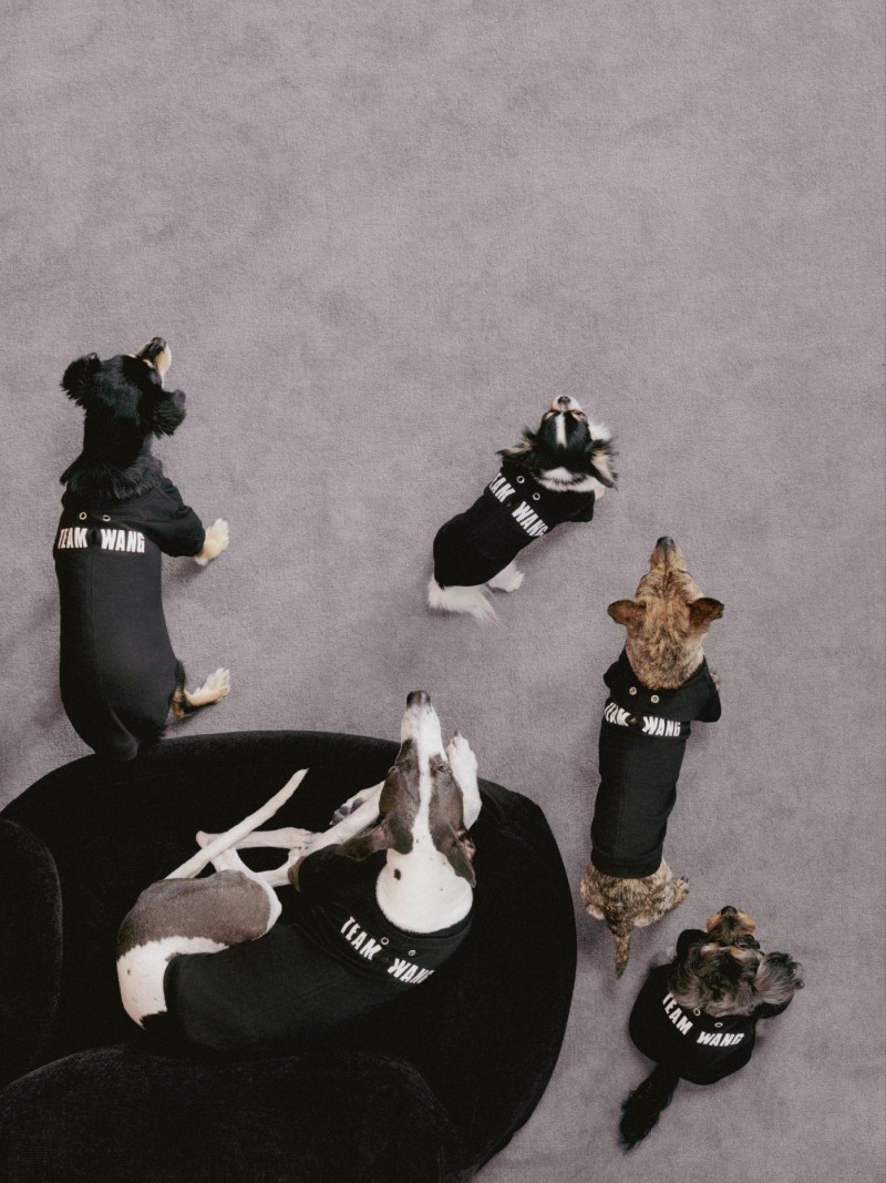 采用柔软透气的棉混纺面料,适合日常穿着,并提供多种尺寸以适配不同体型的宠物。胸前按扣设计方便穿脱,罗纹领口、袖口与下摆提升贴合度与舒适感;背部牵引用开口进一步增强实用性。金属标牌与背部标志性 “TEAM WANG” 印花搭配银色五金细节,呈现品牌一贯的精致风格。